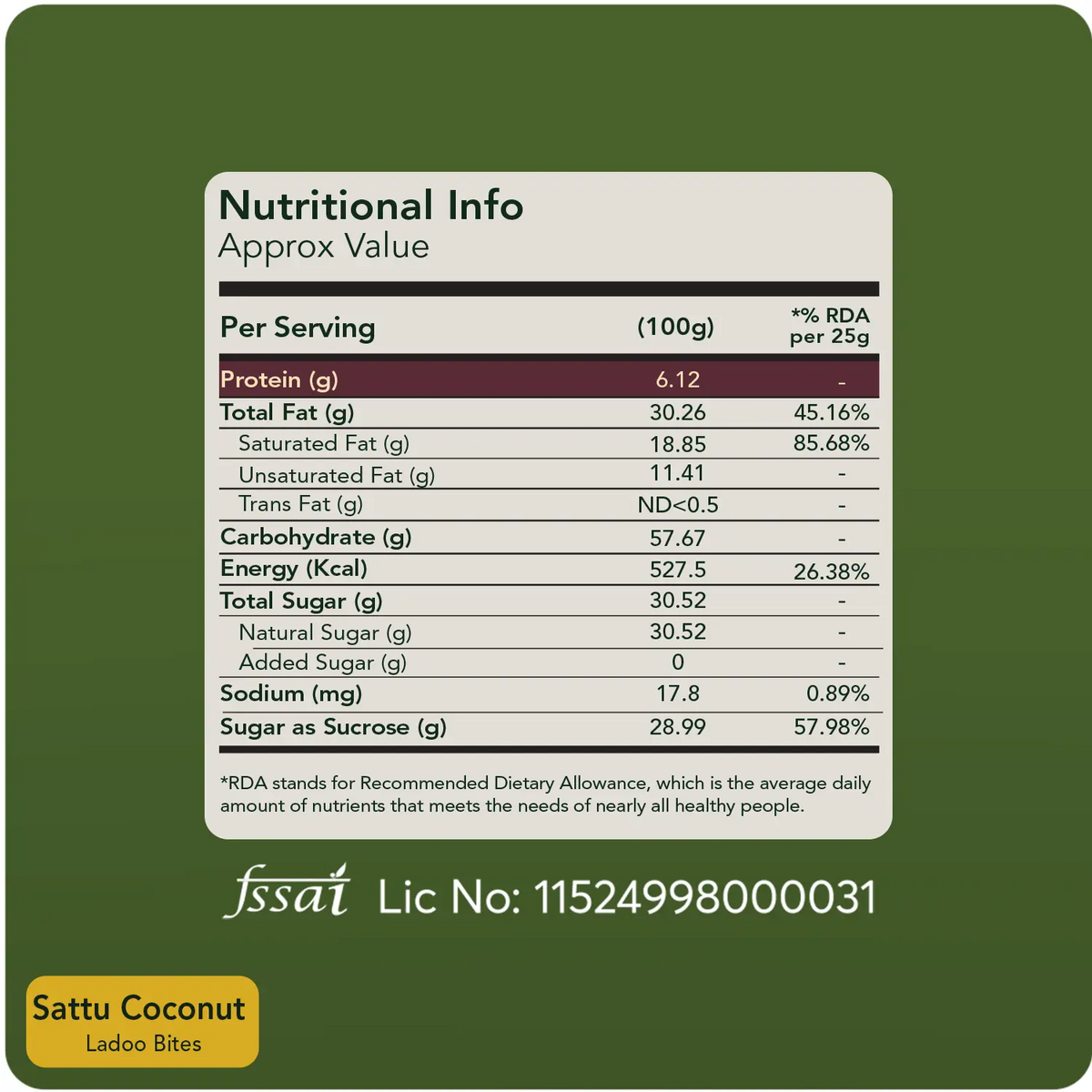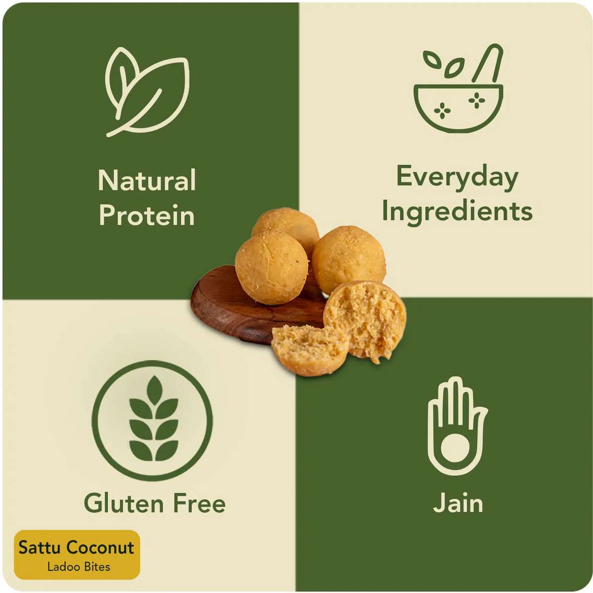 3 Natural Ingredients: Sattu (protein-rich roasted gram flour), fresh coconut, and organic jaggery.