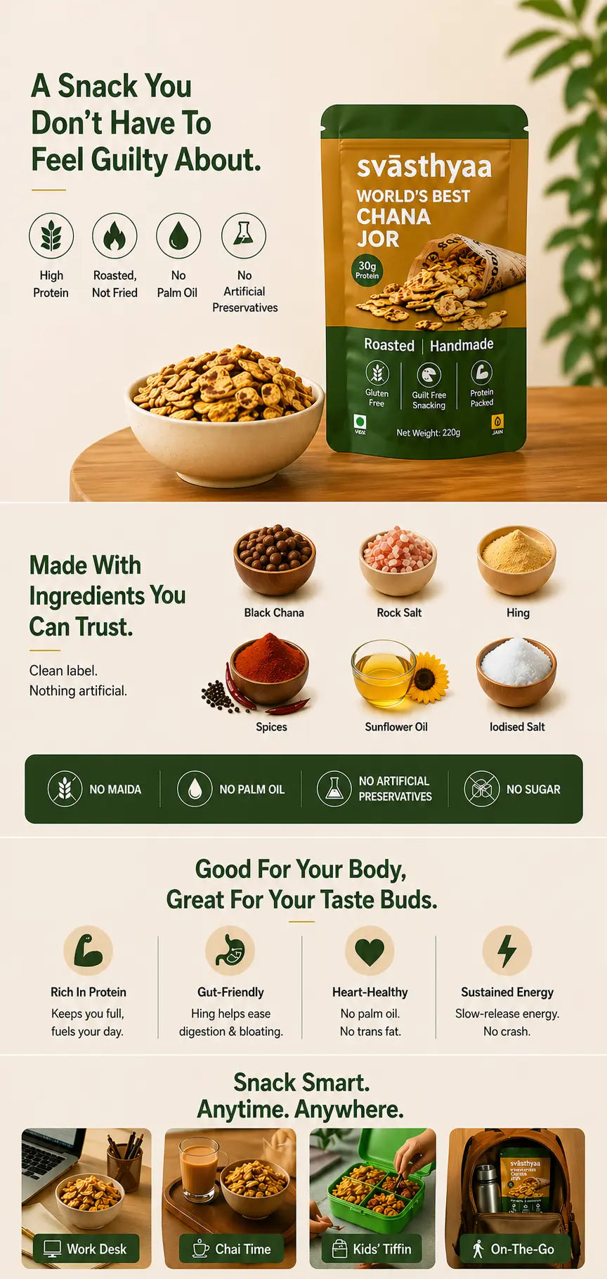 Perfect as an evening snack or a quick bite on busy days, our Chola Fadi khakhra pairs wonderfully with your favorite chutneys or dips, or can be savored just as it comes. Satisfy your cravings with something crunchy, flavorful, and inherently good for you!