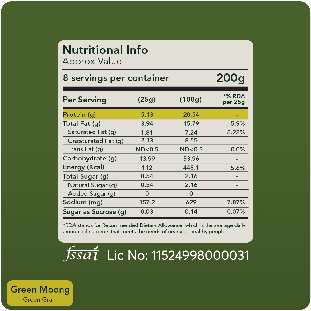 • Supports Digestive Health: High in dietary fiber, green moong promotes healthy digestion and contributes to gut health.