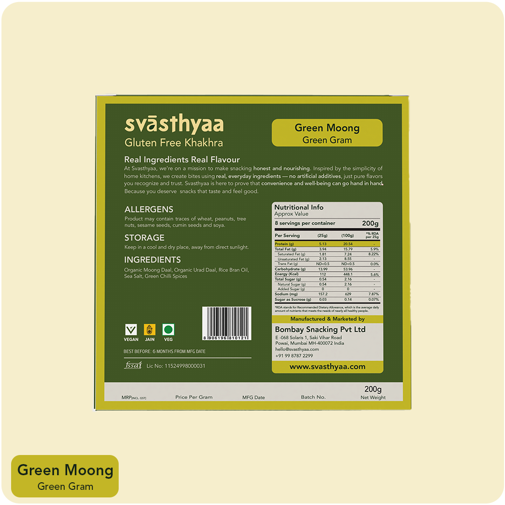 The primary Ingredient of Svasthyaa Organic Foods Green Moong Khakhra include Green Moong (Green Gram), Urad Daal, Non Refined Filtered Rice Bran Oil, spices, iodised salt, and green chilli.