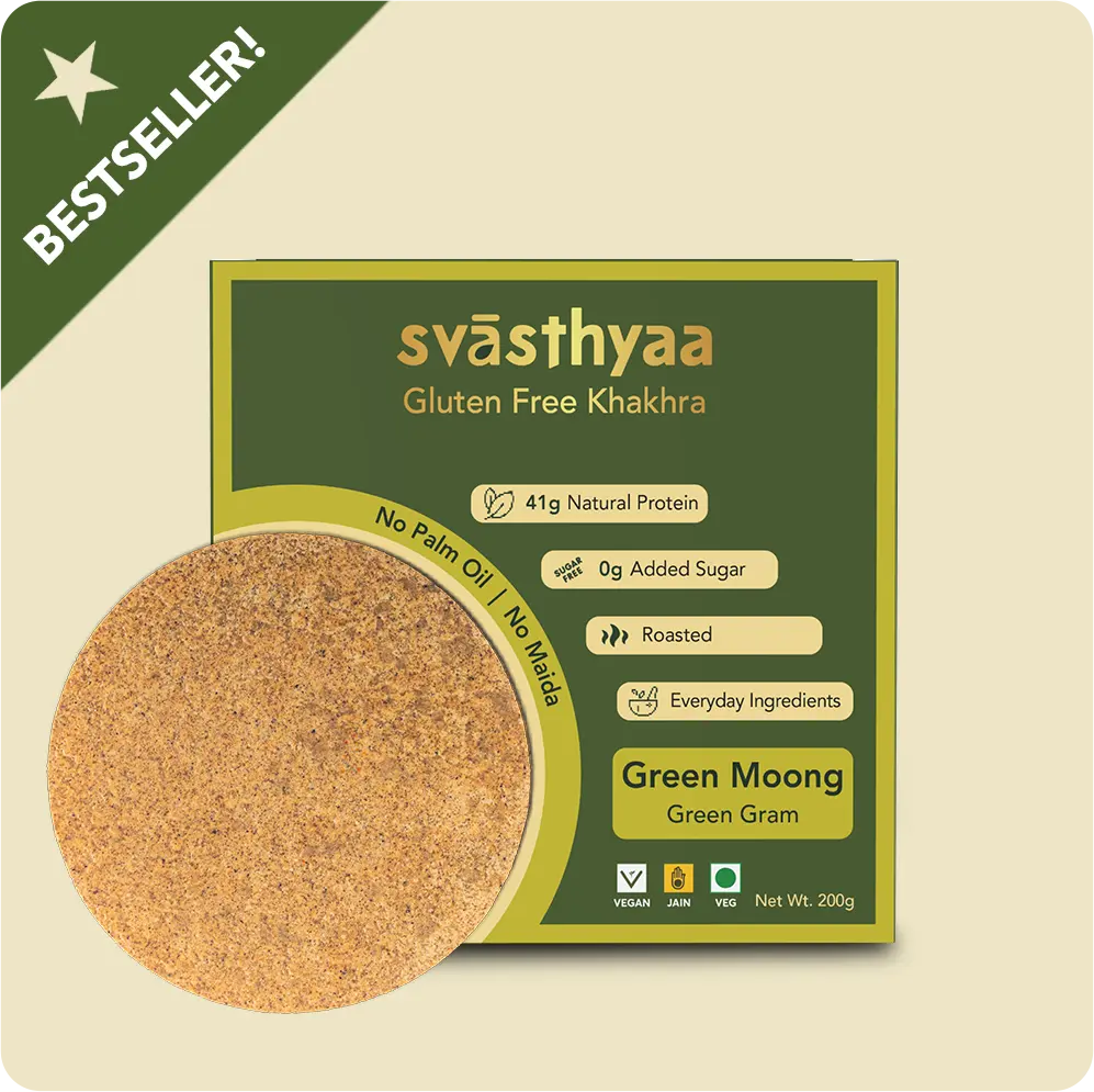 Svasthyaa Green Moong Khakhra is gluten-free, high in natural proteins, low in carbs, and suitable for diabetics. It is free from artificial additives, preservatives, and added sugar, and is 100% roasted.