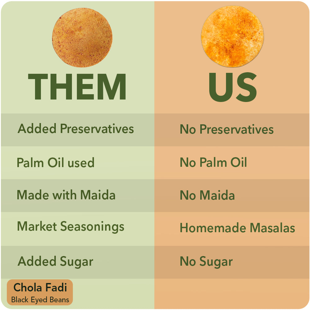 Perfect as an evening snack or a quick bite on busy days, our Chola Fadi khakhra pairs wonderfully with your favorite chutneys or dips, or can be savored just as it comes. Satisfy your cravings with something crunchy, flavorful, and inherently good for you!