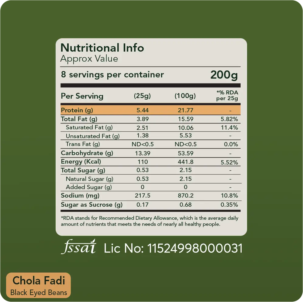 Svasthyaa Organic Foods Chola Fadi Khakhra is made with Indian Lobia / Chawli (black-eyed peas), Urad Daal, Chana Daal, Non Refined Filtered Rice Bran Oil, and a blend of spices.