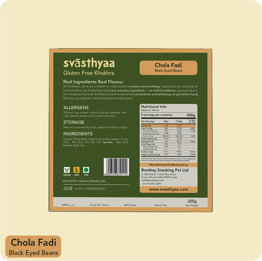 Svasthyaa Chola Fadi Khakhra is gluten-free, full of protein, low in carbs, and good for people with diabetes. It has no artificial stuff or added sugar, and is fully roasted.
